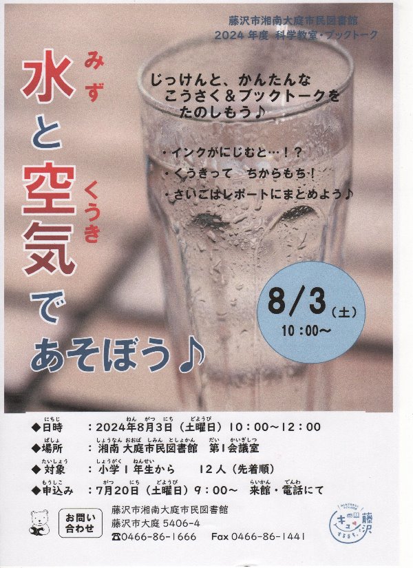 湘南大庭市民図書館『水と空気であそぼう♪~2024年度 科学教室・ブックトーク~』(定員に達しました) 終了しました 湘南大庭