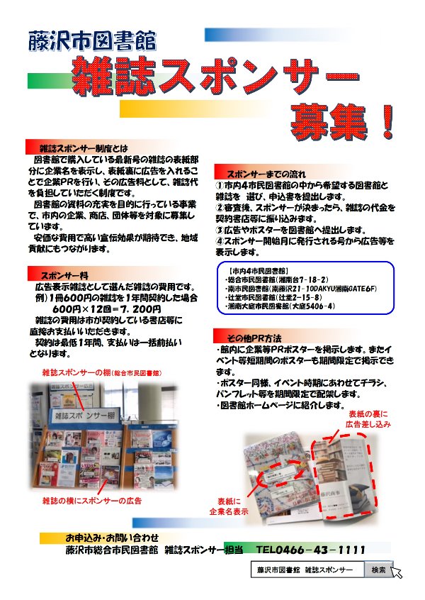 藤沢市図書館では、平成27年度から雑誌スポンサー制度を実施しています。図書館の雑誌の購入費を負担していただき、提供していただいた雑誌にスポンサー名を表示します。