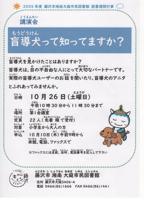 いべんと 湘南大庭市民図書館 読書週間行事 講演会「盲導犬って知ってますか?」(終了しました) 終了しました 湘南大庭