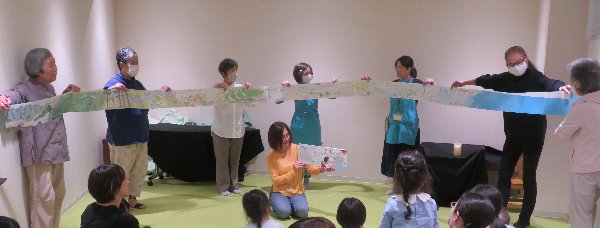 かこさとしさんの『かわ-絵巻じたてひろがるえほん-』(福音館書店)をはじめ、大型絵本などや大型紙芝居を楽しんでもらいました。