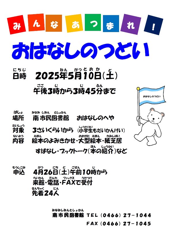 いべんと 南市民図書館 2025年こどもの読書週間行事『おはなしのつどい』(終了しました) 終了しました