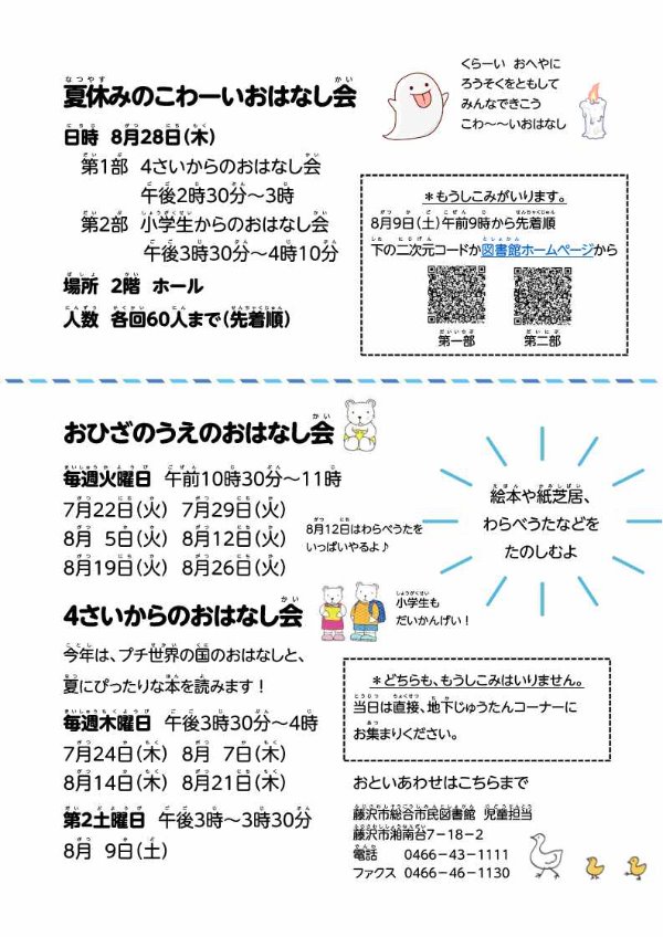 内容 夏休み期間中、4さいからのおはなし会は、今年も
