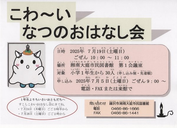 くらいおへやで、こわ~いおはなしをきいてみませんか。 小学1年生からはいれます。 日にち:2025年7月19日(土曜日) 時間:午前10時から11時 場所:湘南大庭市民図書館 第1会議室 対象:小学1年生から 人数:30人(申し込み制・先着順) 申込:7月5日(土曜日)午前9時から 電話、ファックス、来館で