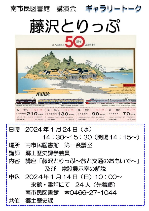 南市民図書館講演会 ギャラリートーク「藤沢とりっぷ~旅と交通のおもいで~」のポスター