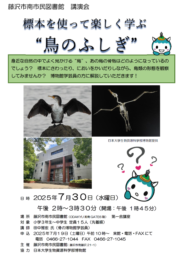 南市民図書館 講演会「標本を使って楽しく学ぶ❝ 鳥のふしぎ ❞」ポスター