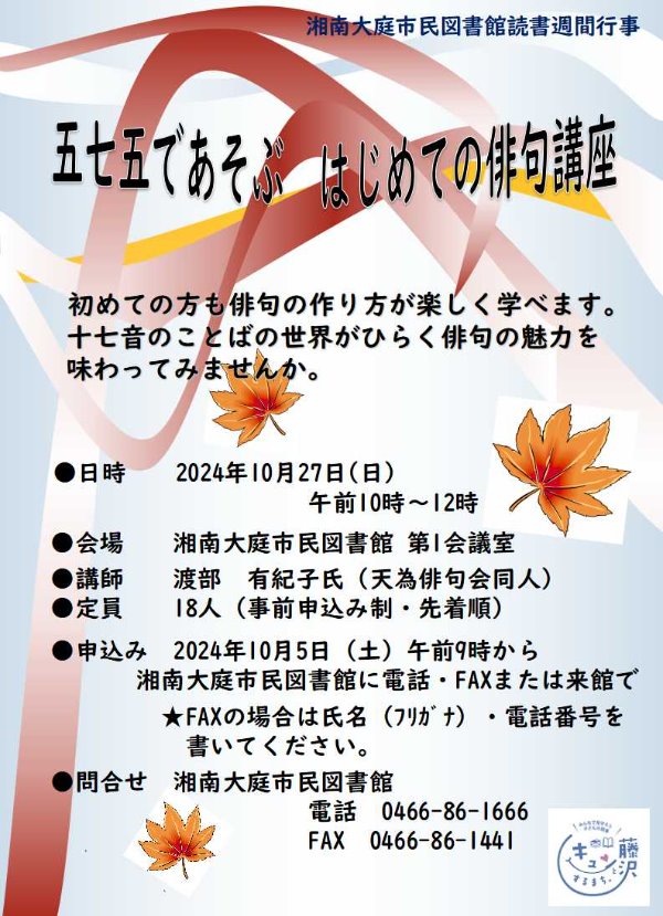 藤沢市内各地で詠まれた俳句を鑑賞した後、秋の季語を使って俳句を詠む講座です。