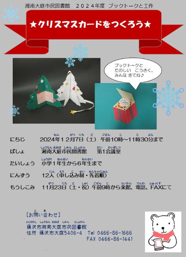 湘南大庭市民図書館 ブックトークと工作「クリスマスカードをつくろう☆」(終了しました) 終了しました 湘南大庭