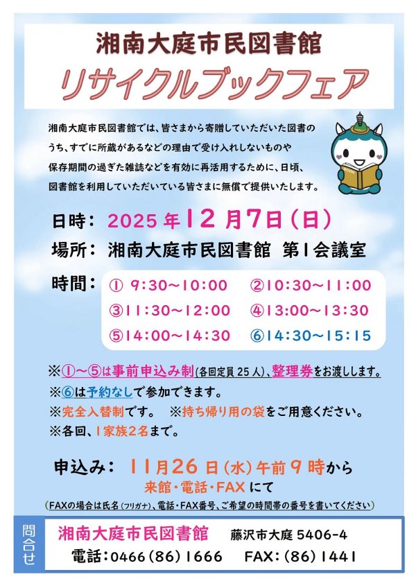 湘南大庭市民図書館では、今年もリサイクルブックフェアを開催いたします。