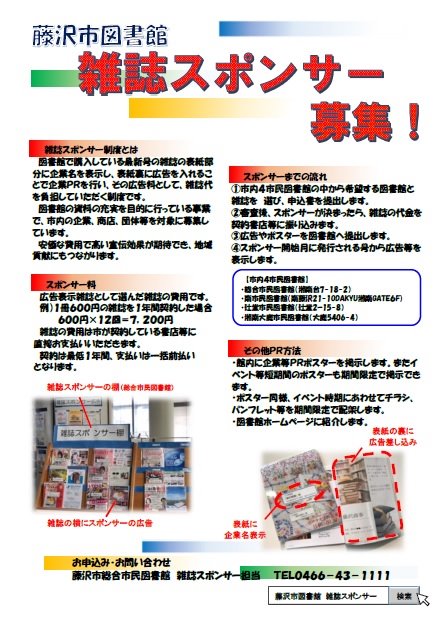- 藤沢市図書館では、平成27年4月から、雑誌スポンサー制度を実施しています。図書館(総合、南、辻堂、湘南大庭の4市民図書館)の雑誌の購入費を負担していただき、提供していただいた雑誌の表紙裏カバー及び雑誌架等にはスポンサー名を表示します。雑誌スポンサーは、図書館来館者にPRができ、イメージアップにもつながります。
