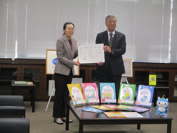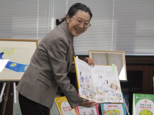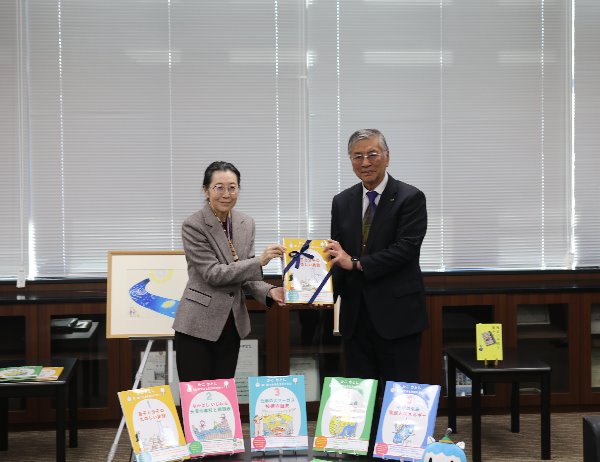 このたび、有限会社加古総合研究所様から11月25日に刊行された 『かこさとし 新・絵でみる化学のせかい』全5冊を本市4市民図書館に寄贈していただきました! 1981年に刊行された『絵で見る 化学のせかい』シリーズのうち、現在出版されている 「世界の化学者12か月』を除く5冊を大型化し、データを最新(2024年時点)のものに、 時世の変化に合わせて表現方法を変え、改定改題したものです。 その寄贈式が11月27日(水曜)に行われました。