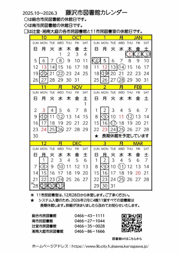 2025年4月から2026年3月までの図書館カレンダーができましたのでご活用ください。 各市民図書館・市民図書室で順次配布いたします。