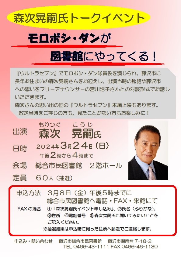 『ウルトラセブン』でモロボシ・ダン役を演じられ、藤沢市に長年お住まいの森次 晃嗣さんをお迎えし、出演当時の秘話や藤沢市への思いをフリーアナウンサーの宮川浩子さんとの対談形式でお話しいただきます。