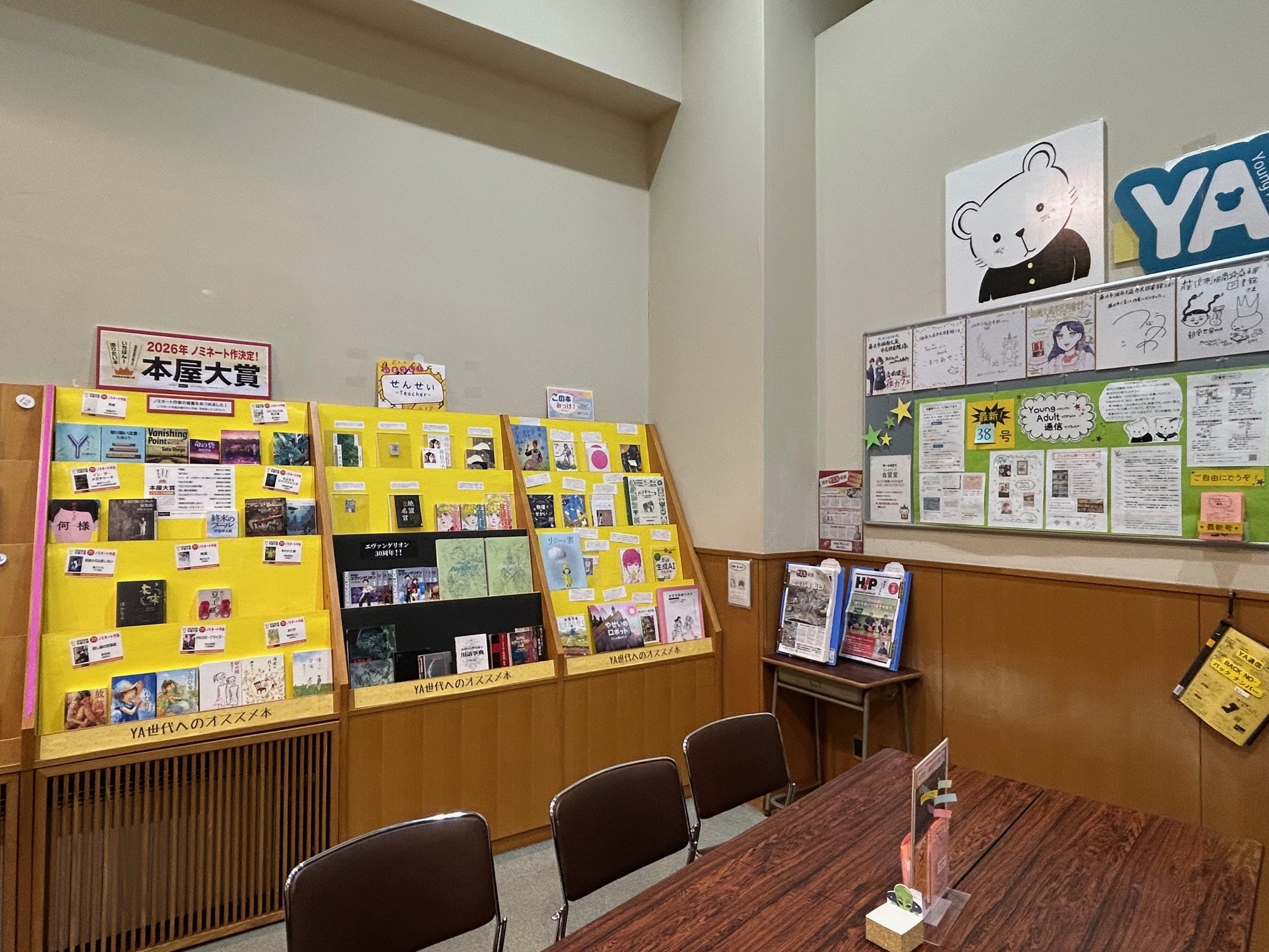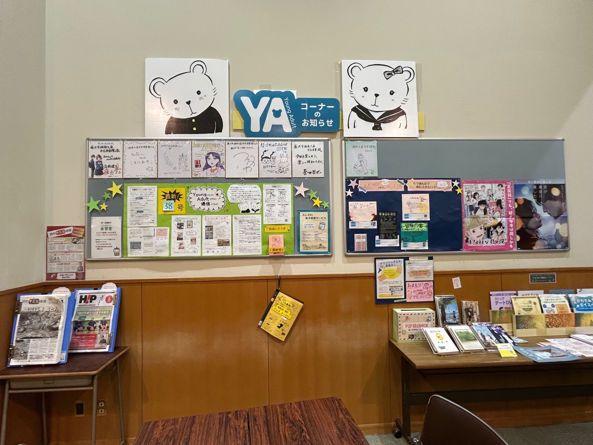 掲示板には、新しく入った本や、10代のみんなが描いてくれたオススメのPOPを紹介しています。