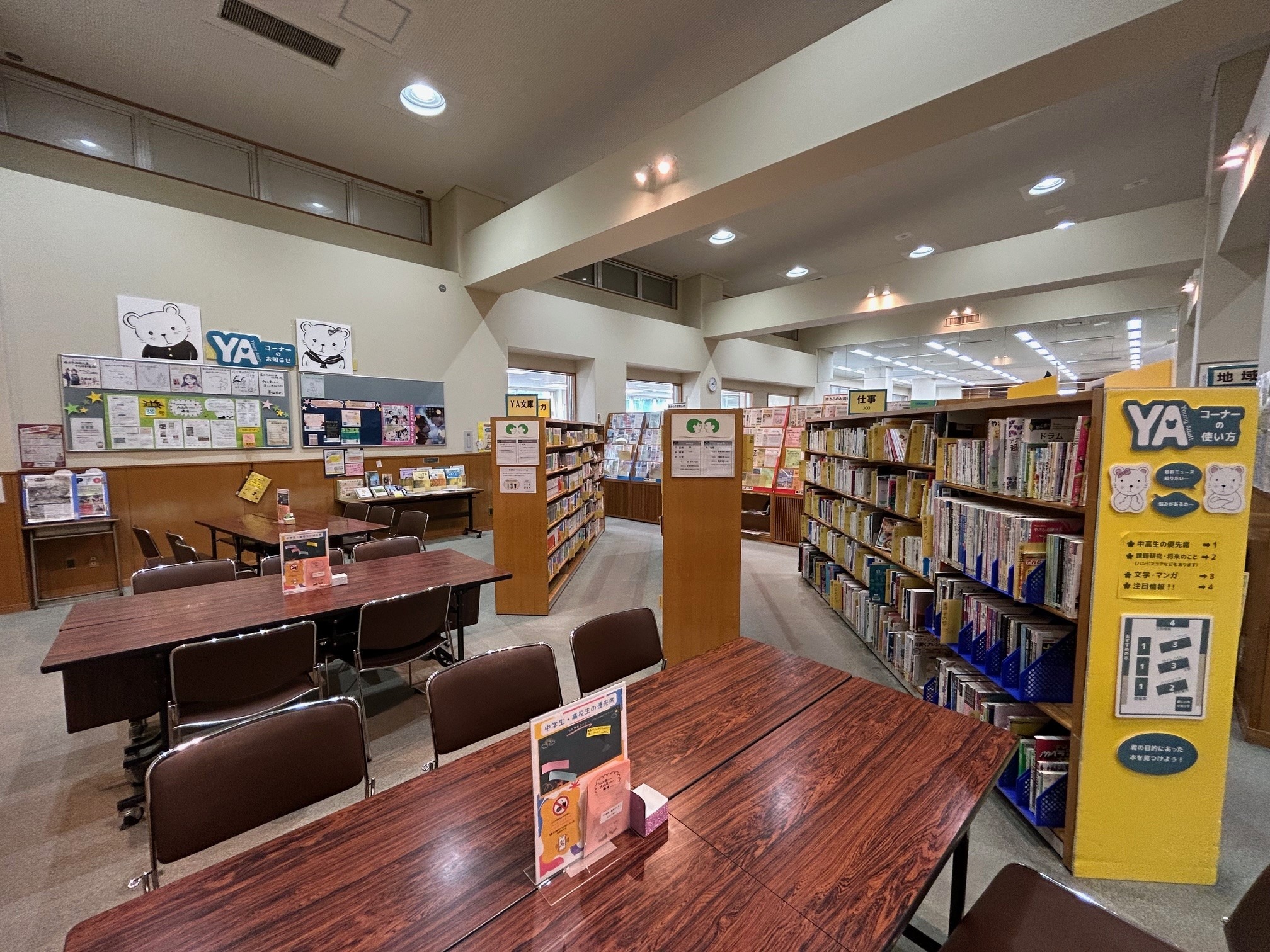 YAコーナーは入ってすぐ左のスペースにあります。10代向けの部活や進学案内、将来の仕事に関する本、バンドスコア、ライトノベル、コミックなどがたくさんそろっています。