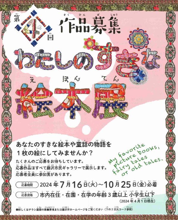藤沢市民ギャラリーでは「第4回わたしのすきな絵本展」出展作品を募集しています。 あなたのだいすきな絵本や童話の物語を1枚の絵にしてみませんか? たくさんの作品をお待ちしています。 募集期間: 2024年7月16日(火曜日)から10月25日(金曜日)まで 「第4回わたしのすきな絵本展」作品募集 ポスター