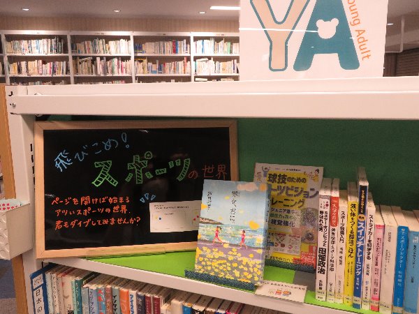 ページを開けば始まるアツいスポーツの世界。 この夏、君もダイブしてみませんか? ブラックボードでアンケートも実施中です。 YA(ヤングアダルト)展示コーナーにて 9月8日(日曜日)まで