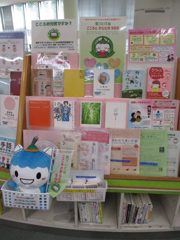 毎年9月10日から16日は「自殺予防週間」です。 総合市民図書館では保健予防課と連携し、「自殺予防週間」関連本の展示、リーフレット、チラシの配布を行っています。 どうぞ、お立ち寄りください。 【展示期間・展示場所】 2024年8月29日(木曜日)から2024年9月24日(火曜日)まで 総合市民図書館:1階 西口展示コーナー 【展示風景】