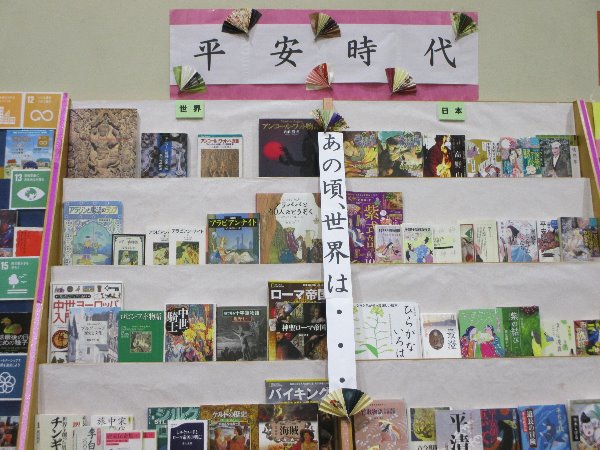 今、大河ドラマで話題の平安時代。日本ではきらびやかな衣装をまとい、優雅な貴族たちの日常が描かれています。 そんな時代に世界では、どんな出来事がおきていたのでしょう。 平安時代と世界の出来事を対比させて展示しています。眺めるだけでも面白いと思います。 YAコーナーで、11月4日(月曜日)まで。