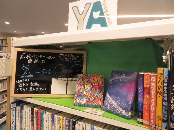 あなたは、タイトルと表紙、どちらで本を選びますか? インターンシップの高校生が厳選した、思わず読んでみたくなる本を展示します。 YA(ヤングアダルト)展示コーナーにて 11月10日(日曜日)まで