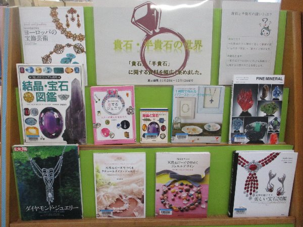 ダイヤ、ルビー・サファイア、水晶、メノウ・・・などなど 綺麗な石ですが、宝石と呼ばれるものは限られています。 大きく分けて貴石と呼ばれるものと半貴石と呼ばれるものに分かれるのですが ひとまず、難しい言葉は置いておいて美しい石の世界を本で見てみませんか? 期間:11月28日(木曜日)から12月28日(土曜日) 場所:総合市民図書館 1階 西口展示コーナー