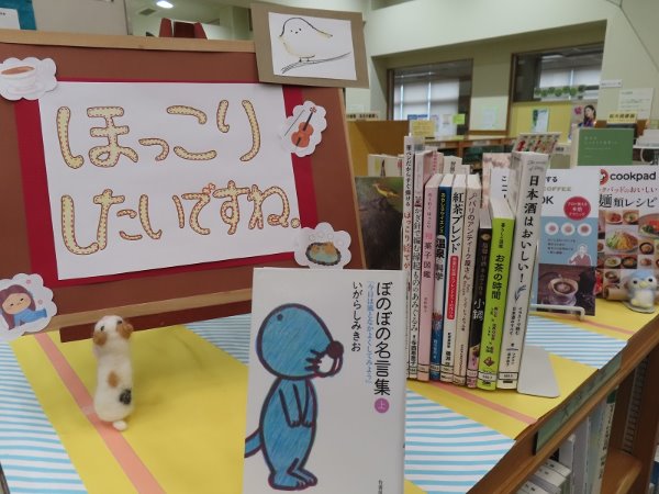 あたたかい春まで、あともう少し。 みなさんがほっこりあたたまる時は、どんな時ですか? 見て、食べて、読んで、 ほっこりする本を集めました。 大型本書架の上で、3月9日(日曜日)まで展示しています。