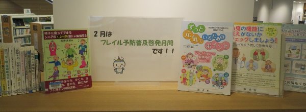 2月はフレイル予防普及啓発月間です。 フレイルとは、体力や気力、認知機能など、からだとこころの機能が低下し 将来介護が必要になる危険性が高くなっている状態をいいます。 日常生活の小さな変化を見落とさないように、関連本を展示しています。 【展示場所・展示期間】 南市民図書館 成人展示展示コーナー②にて 2025年2月28日(金曜日)まで 【展示風景】