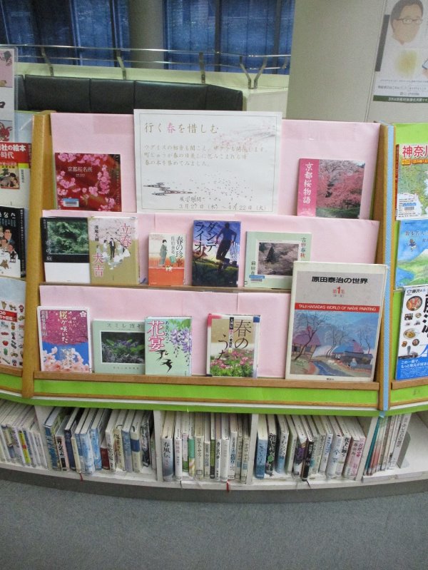 ウグイスの初音も聞こえ、サクラも開花します。 町じゅうが春の日差しに包みこまれる頃 春の本を集めてみました。 期間:3月27日(木曜日)から4月22日(火曜日) 場所:総合市民図書館 1階 西口展示コーナー