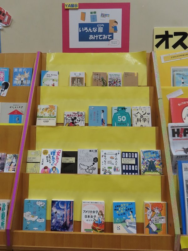 世界は広い。世界はいろいろ。この世は学校とおウチだけじゃないよ! いろんな扉、あけてみて(^^) YA(ヤング・アダルト)コーナーで、11月3日(月曜日・祝日)まで。