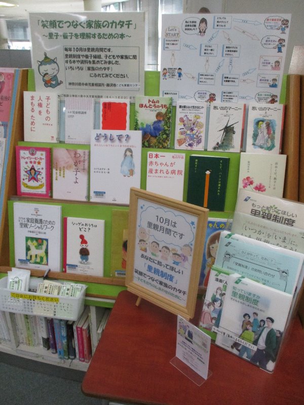 毎年10月は里親月間です。 総合市民図書館では藤沢市こども家庭センターと連携し、里子や養子を理解するための本を展示しています。 いろいろな「家族のカタチ」にふれてみてください。 【展示期間・展示場所】 2025年9月25日(木曜日)から10月21日(火曜日)まで 総合市民図書館 1階 西口展示コーナー 【展示風景】