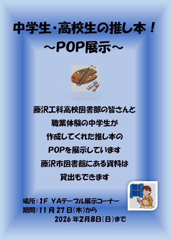 総合市民図書館1階YAテーブルコーナーでは、藤沢工科高校図書部の皆さんと職業体験にきてくれた中学生が描いてくれた「推し本」のPOPを展示しています。